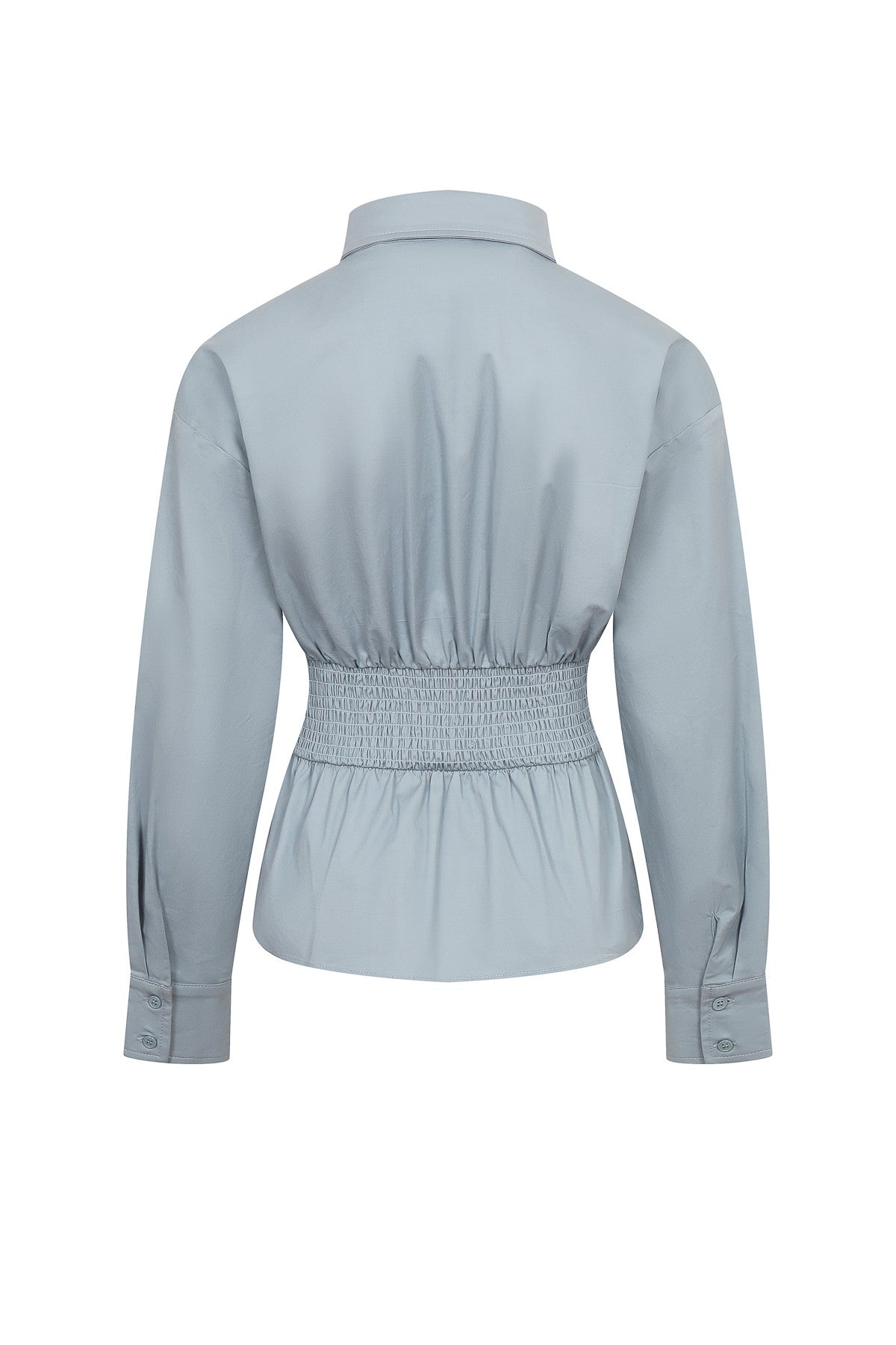Woven Belted Grace Top – Light Blue Collared Blouse with Ruching